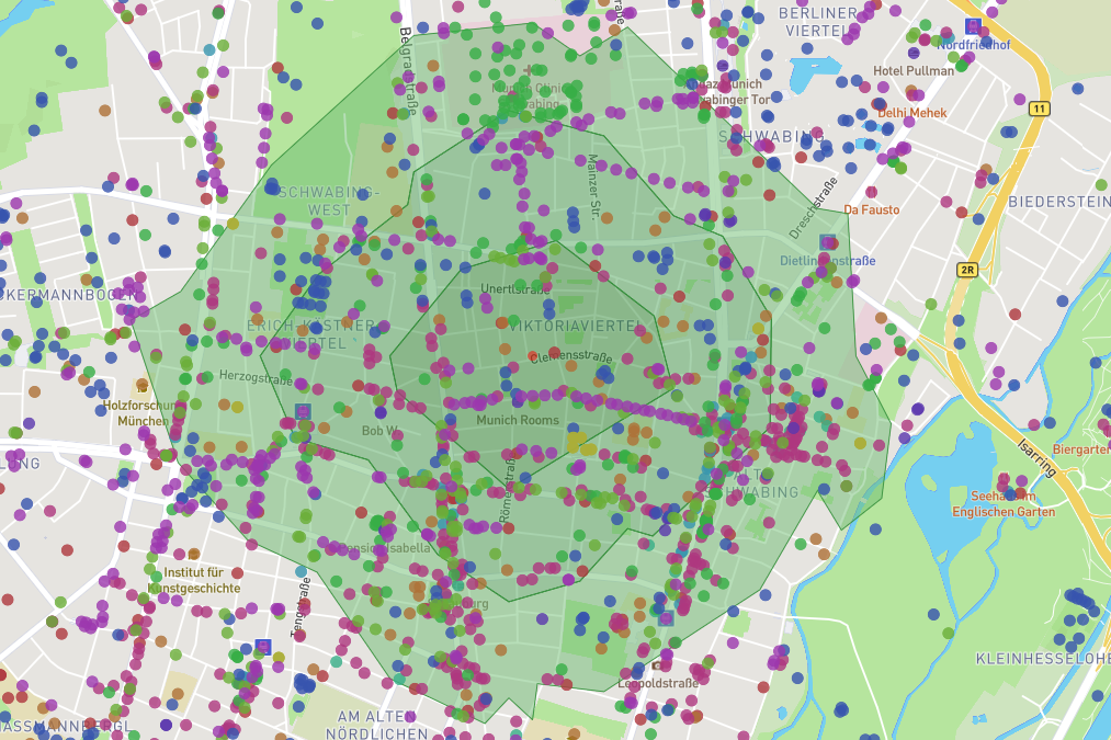 15-minute walking catchment with surrounding amenities, generated for a property in Schwabing, Munich — using global datasets, a few clicks, and just minutes of processing.
